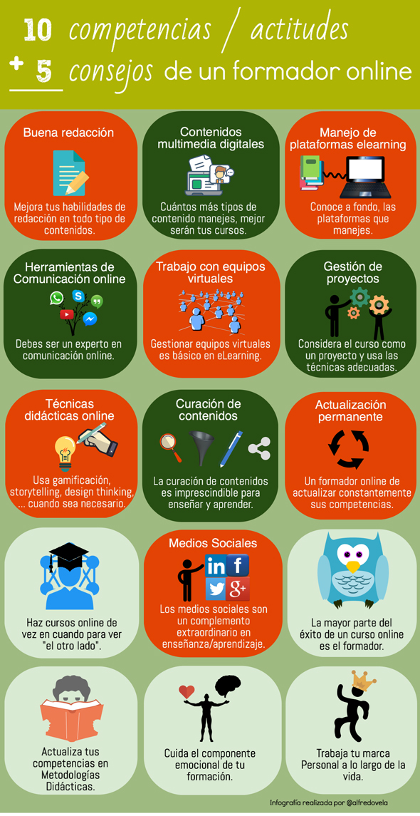 1. Buena redacción: Recuerda que debes desarrollar la habilidad de saber redactar contenidos independientemente del formato. No es lo mismo preparar un contenido para la web que para un e-book, por ejemplo. 2. Contenidos multimedia digitales: En la red proliferan multitud de formatos, cuantos más manejes, mejor serán tus cursos online. 3. Manejo de plataformas e-learning: Por supuesto, busca una plataforma online que sea fácil de manejar y tenga todas las funcionalidades que necesites. 4. Herramientas de comunicación online: Debes conocer cómo funcionan otras herramientas comunicativas, como chats, foros, whatsapp, redes sociales, etc. 5. Trabajo con equipos virtuales: Saber gestionar un equipo virtual es más importante de lo que en un principio puede parecer. 6. Gestión de proyectos: Si tienes conocimientos sobre esta materia, podrás gestionar cada curso online que realices como un proyecto. 7. Técnicas didácticas online: Por supuesto, las técnicas didácticas no sólo tienen cabida en la formación presencial, también en e-learning. Utiliza la gamificación, el storytelling, etc, 8. Curación de contenidos: Al fin y al cabo los contenidos de valor son lo que más importa a tus usuarios. Procura que estén actualizados, contrastados, filtrados, completos, etc. 9. Actualización permanente: Estas competencias deben actualizarse de forma regular, ya que el mundo online cambia de manera vertiginosa y si no te adaptas ni conoces los cambios puedes quedar obsoleto como instructor online. 10. Medios sociales: Ya sabes que las redes sociales son un complemento ideal para tus formaciones online. Explota su potencial.